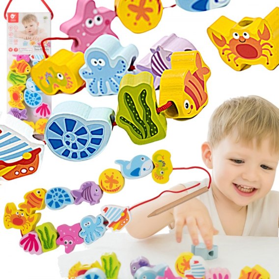 Classic World Koraliki Do Nawlekania Wodne Zwierzęta to idealna zabawka do rozwijania umiejętności motorycznych dziecka. Przeplatanka dla dzieci utrzymana została w motywie podwodnego świata zwierząt. Zabawka przeplatanka marki Classic World to klasyczny zestaw drewnianych elementów z dziurkami, przez które dziecko przeplata sznureczek. Jest to świetna zabawa, która rozwija zręczność, oraz wzbudza ciekawość dziecka na temat zwierząt mieszkających w lesie.