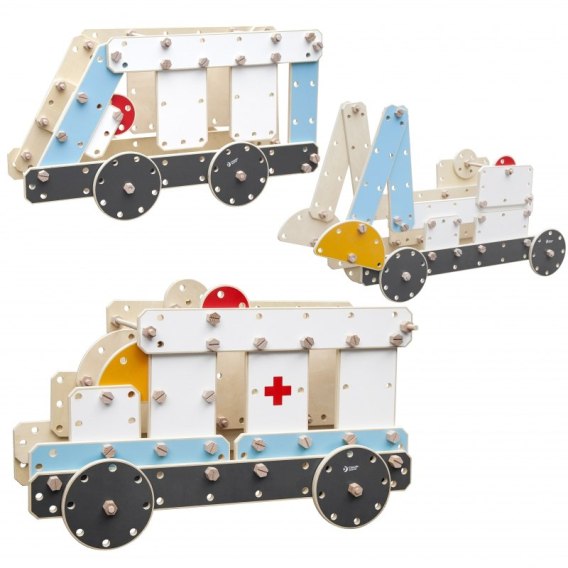 CLASSIC WORLD Drewniane Klocki Konstrukcyjne - Zestaw dużych klocków Jasnoniebieskie, jest to komplet ogromnych klocków drewnianych, , składający się ze 124 elementów, z których możemy zbudować z naszą pociechą różne pojazdy- ambulans, koparkę lub minivana. Doskonały produkt do spełnienia marzeń każdego fana motoryzacji. Zestaw należy złożyć z osobą dorosłą. Zestaw można składać według dołączonych instrukcji lub wedle wyobraźni naszej i dziecka. Produkt rozwija kreatywność i wyobraźnię naszego dziecka. Zabawa klockami ma pozytywny wpływ na rozwój dzieci. Oddziałuje na ich koncentrację, poprawia koordynację wzrokowo - ruchową, kształtuje umiejętność planowania i umiejętności manualne, dodatkowo uczy też orientacji przestrzennej, precyzji, a także ćwiczy zmysł równowagi! Świetnie sprawdzą się również do nauki pracy zespołowej. Klocki zbudowane z najwyższej jakości drewna i pomalowane nietoksycznymi farbami. Idealnie sprawdzą się do użytku domowego jak również w każdej placówce wczesnoszkolnej. Przeznaczone dla dzieci powyżej 3 roku życia.
