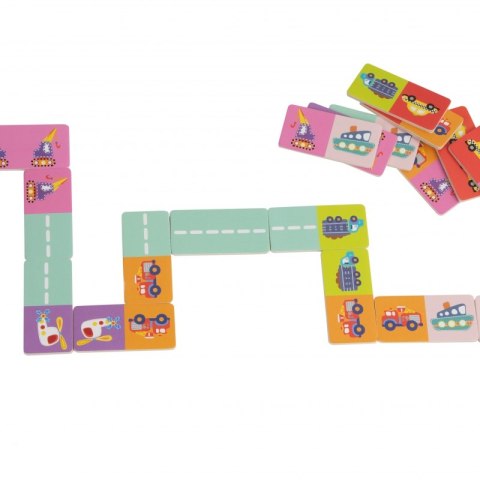 - - Kolorowy zestaw Domino z pojazdami polega na prawidłowym dopasowaniu do siebie pojazdów.