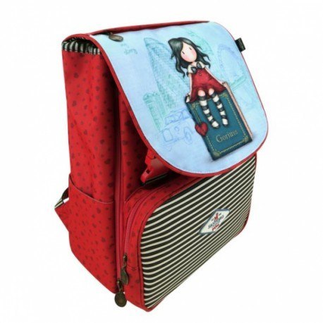 Gorjuss - Plecak - My Story Wyjątkowo praktyczny i duży plecak z wizerunkiem dziewczynka Gorjuss w odcieniach czerwieni rubinowej i głębokiego turkusu. Ma miękkie i wygodne uchwyty do założenia na plecy z regulacją długości. Kieszenie zamykane na suwaki ozdobione medalionami w stylu antycznego mosiądzu z główką dziewczynki Gorjuss. Przestronne wnętrze ozdobione stylowymi paskami.  Obszerna kieszeń przeznaczona na większe elementy ściągana na sznurek Zawiera dwie kieszenie oraz schowek na suwak. Na zewnątrz praktyczna, obszerna kieszonka na drobiazgi. Po bokach funkcjonalne kieszonki na napoje. Całość przykrywana solidną klapą zamykaną na dwa zatrzaski. Na klapie ukryta kieszeń na suwak. Rozmiar: 43cm. x 29cm. x 18cm.