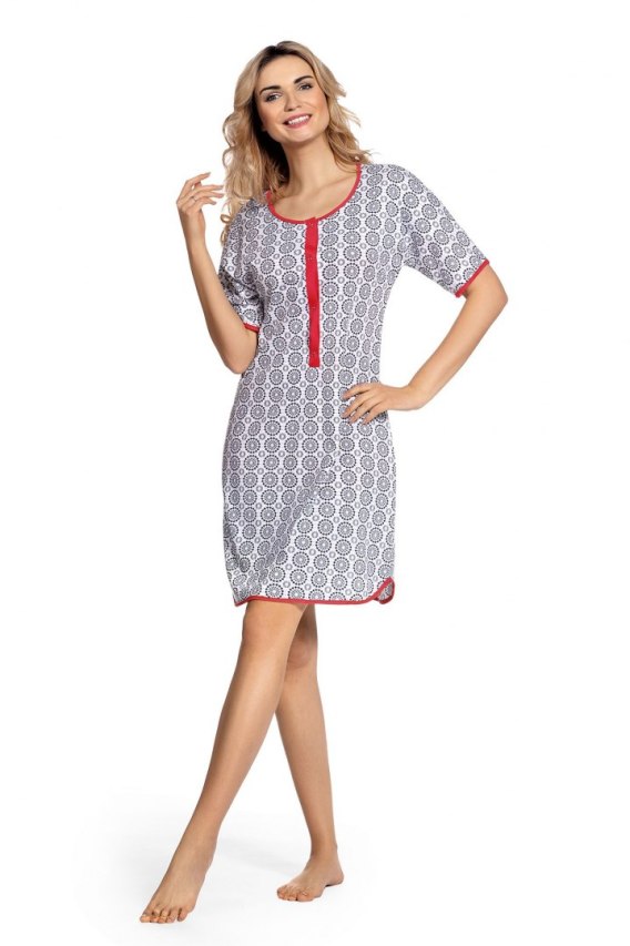 Koszula nocna z krótkim rękawem, wykonana z wysokiej jakości bawełny. Dekolt rozpinany na guziczki. Doskonała propozycja dla mam karmiących. Skład: 100% bawełna