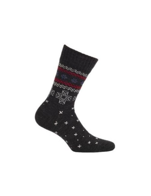 Ciepłe skarpetki wełniane z dodatkiem wełny w piękne wzory. Doskonale izolują przed mrozem i chłodem. Przyjemne w dotyku i noszeniu, nie podrażniają skóry, amortyzują stopę. Odporne na ścieranie. Idealne na piesze wycieczki.