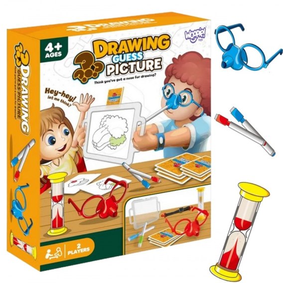 Czy wyobrażałeś sobie kiedyś, że rysujesz wyłącznie nosem? Dzięki wspaniałej grze "Narysuj i Zgadnij Obrazek" od marki WOOPIE będzie to możliwe, ponieważ to będzie twoje zadanie! Załóż specjalne okulary z markerem, i namaluj na tablicy przed sobą wylosowany obrazek - to jedyny sposób, aby Twoja drużyna odgadła wylosowane hasła. Czasu jest niewiele, więc śpiesz się, bo klepsydra już tyka!