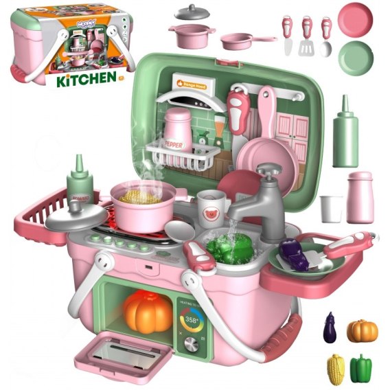 Zestaw Małego Kucharza w Koszyku od marki WOOPIE pozwoli Twojemu dziecku bawić się w szefa kuchni wszędzie i kiedy tylko zechce. Dzieci uwielbiają pomagać rodzicom w kuchni oraz wspólnie z przyjaciółmi współpracować podczas wspólnego gotowania. Zestaw zawiera 30 elementów: wszystkie potrzebne rzeczy, które posiada każdy kucharz. Dodatkowo, do zestawu wbudowana jest mikrofalówka, zlew i palnik! Zestaw ma wspaniałe funkcje, które sprawią, że dziecko poczuje się, jakby gotowało na prawdziwej kuchence: funkcję pary wodnej (imitacja gotowania z garnków), funkcje prawdziwej wody z kranu oraz efekty świetlne jak świecący się palnik. Do funkcji świetlnej i pary wodnej zabawka ma guziki, które umożliwiają włączenie i wyłączenie efektów. Zabawka pełni funkcję koszyka, co pozwoli zabrać zestaw wszędzie. Odgrywanie ról i naśladowanie rodziców rozwija świadomość Twojego dziecka oraz pobudza wyobraźnie i kreatywność.